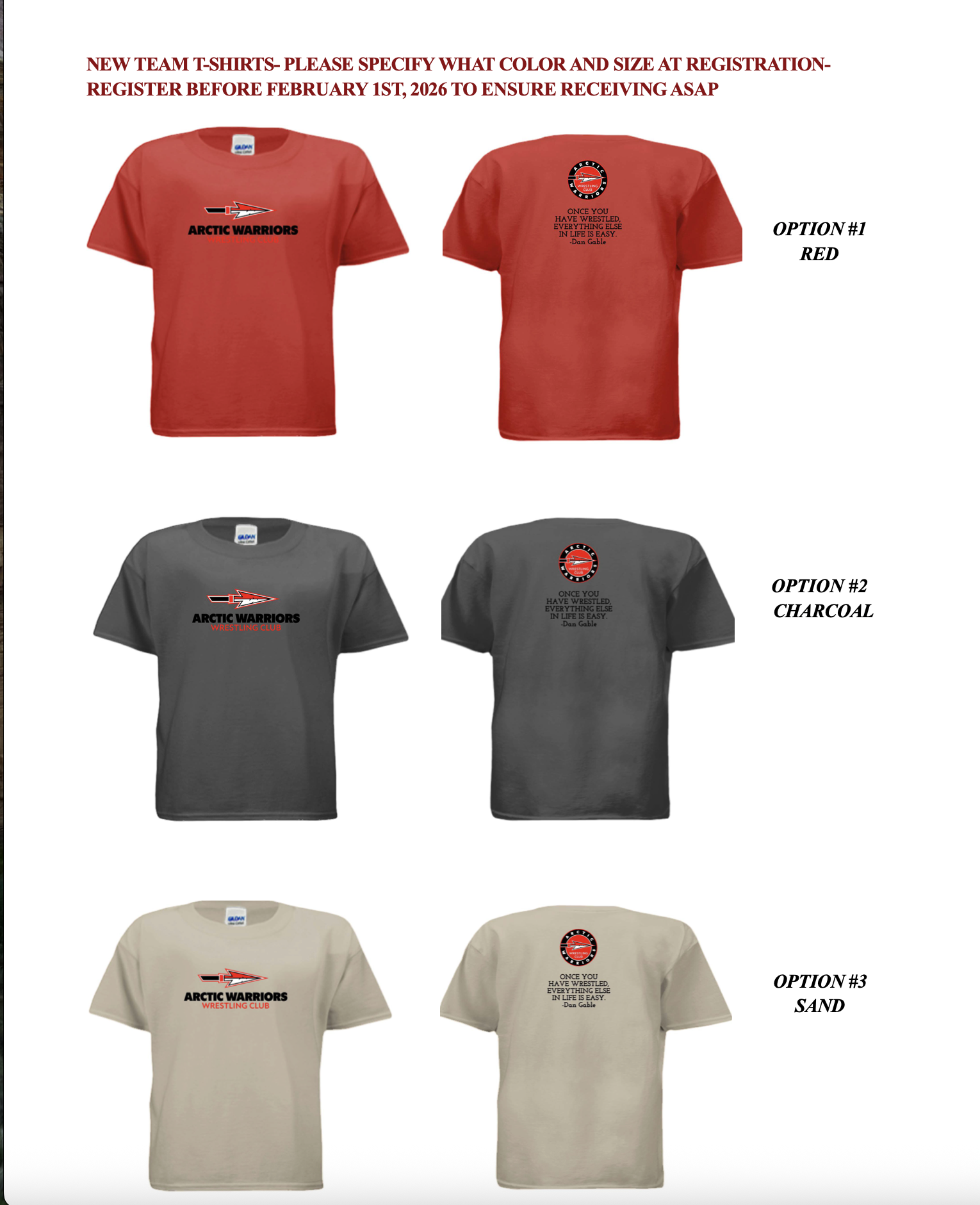 Every wrestler will get a t-shirt with registration. Please choose between red, charcoal or sand when registering child.