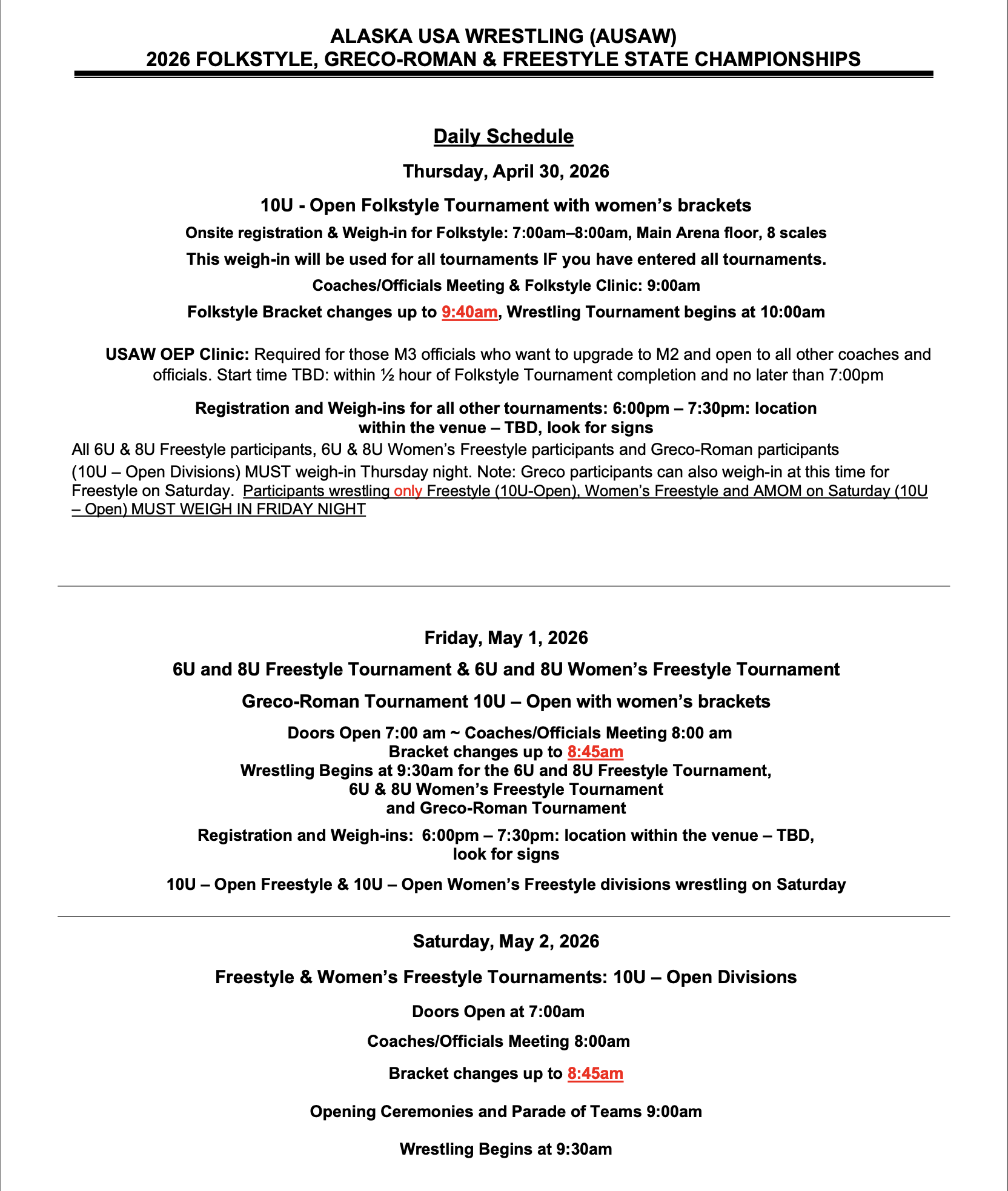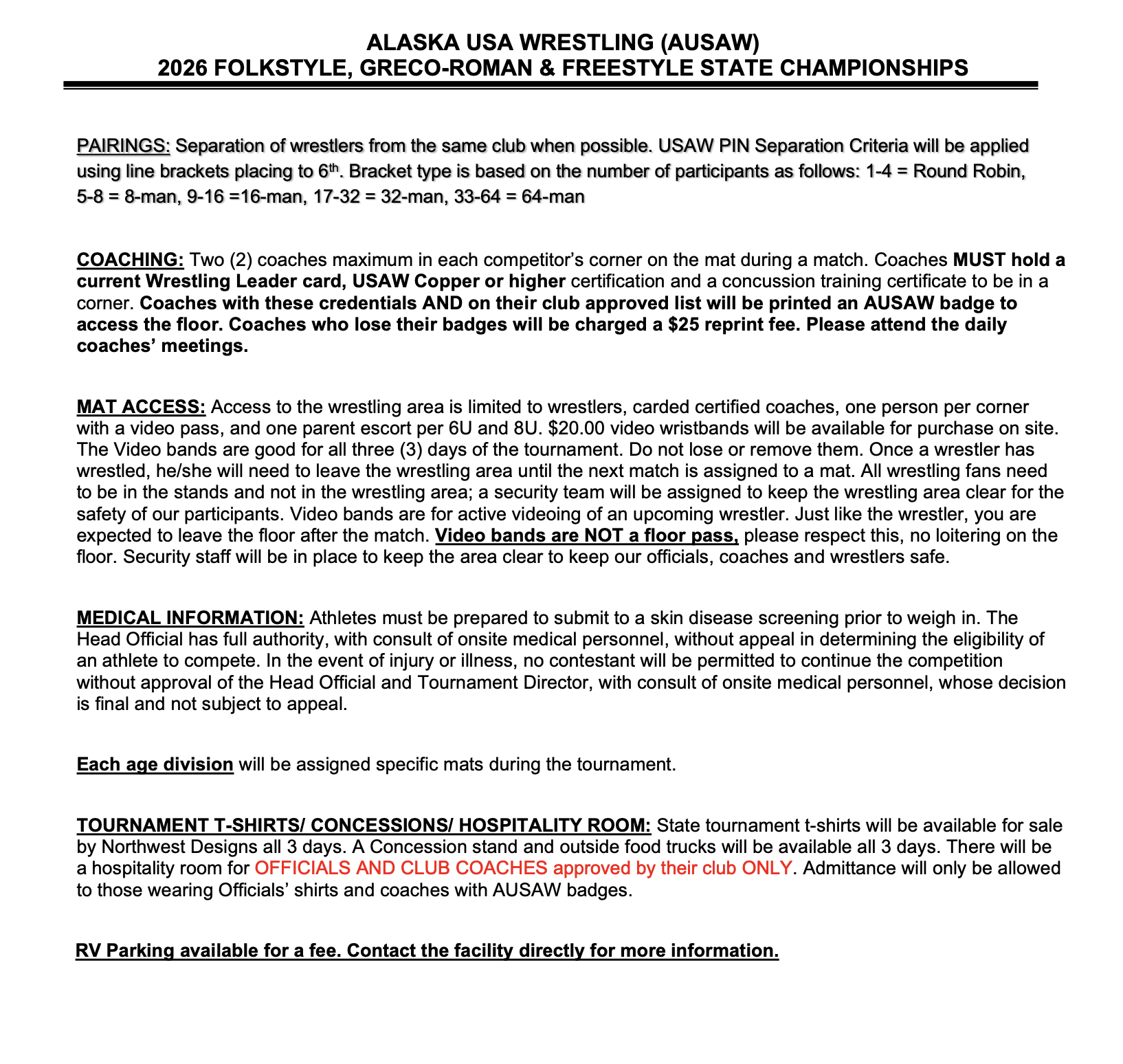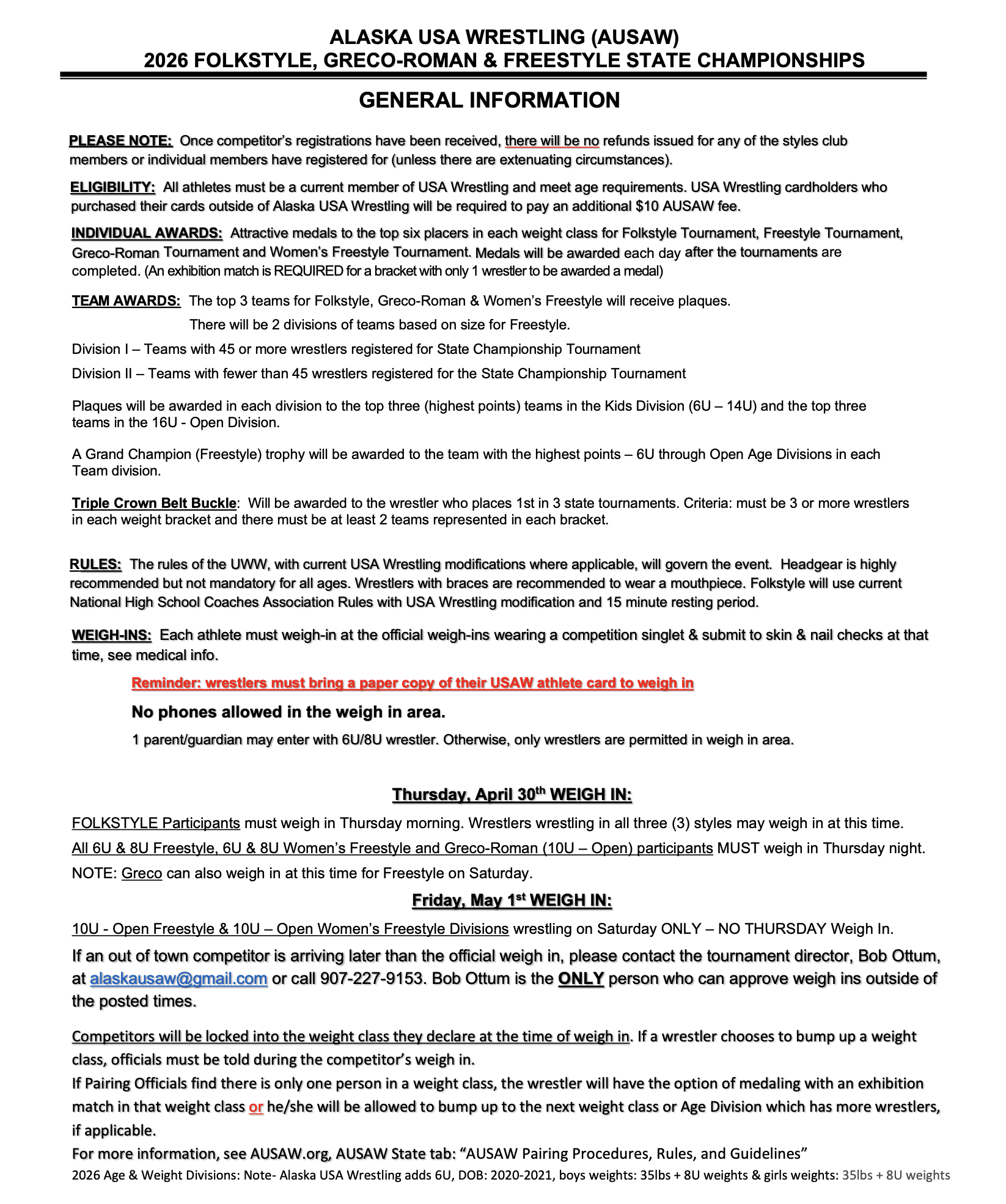 SATELLITE WEIGH-INS WILL OCCUR THE THURSDAY BEFORE A FRIDAY/SATURDAY TOURNAMENT. WRESTLER MUST WEAR A SINGLET AND HAVE NAILS CLIPPED BEFORE STEPPING ON THE SCALE.